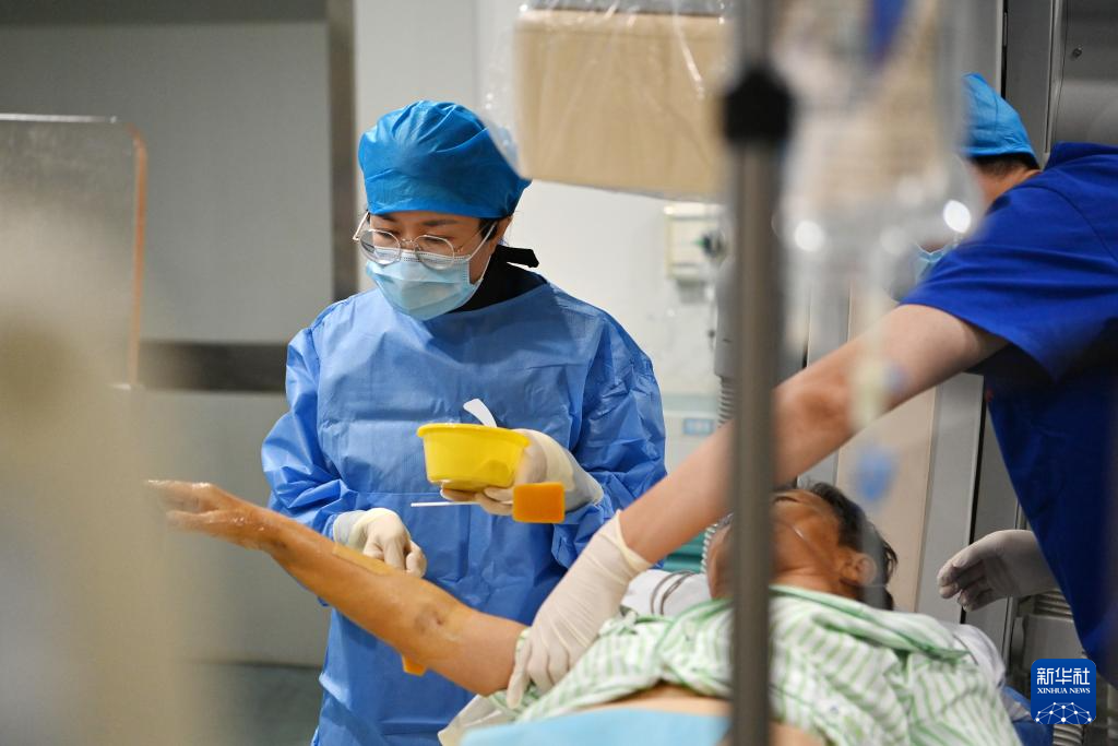 王丽在天津市第一中心医院(复康路院区)给病人消毒(8月15日摄)。新华社记者 李然 摄pagebreak