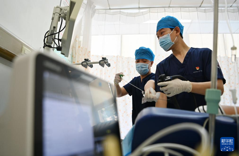 宋立君(右)在天津市第一中心医院(复康路院区)给病人做无痛胃镜检查(8月16日摄)。新华社记者 李然 摄pagebreak