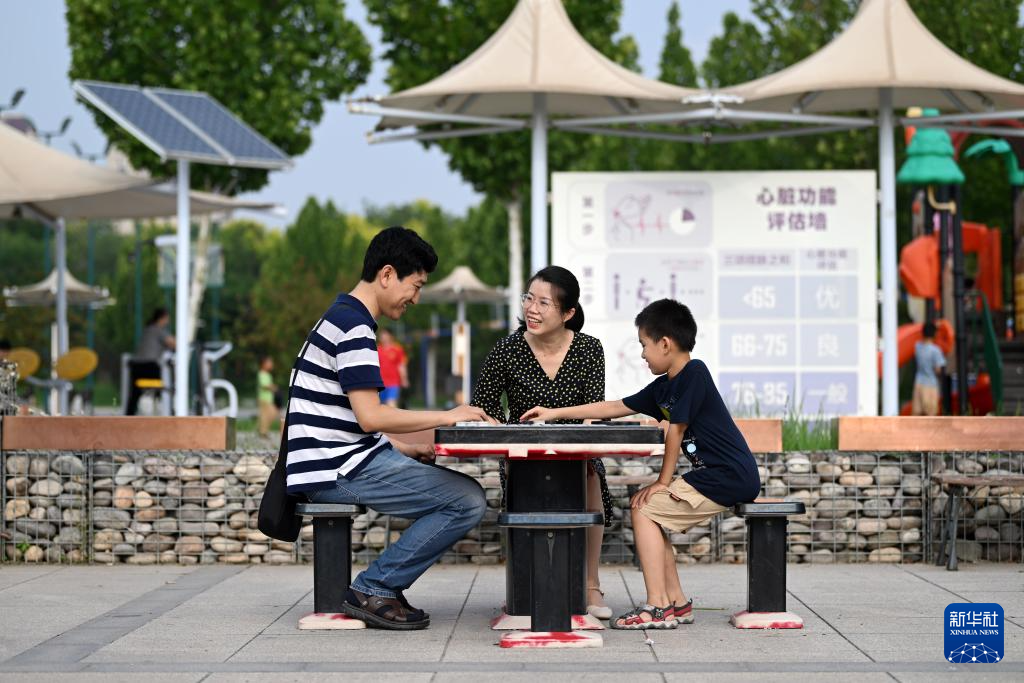 宋立君(左)和王丽(中)带着孩子在天津市水西公园内下棋(8月18日摄)。新华社记者 李然 摄