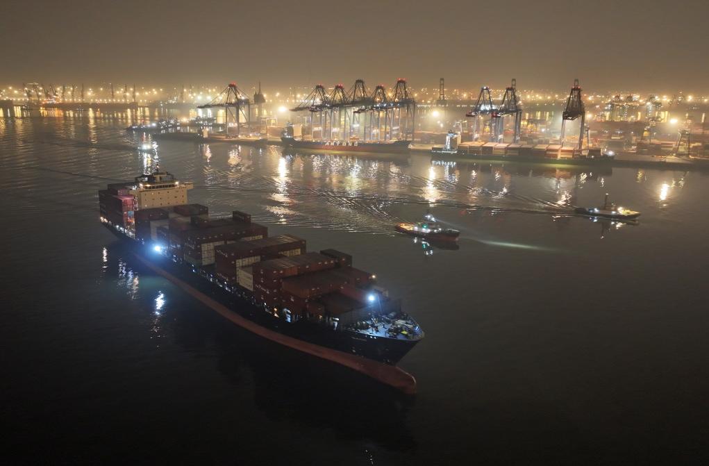 临近凌晨,一艘巨轮横跨太平洋后,缓缓驶进天津港,踏碎海面上的灯光倒影,稳稳停靠在泊位上。码头工人们迅速行动,齐心协力固定好缆绳。随后,集装箱在港区内开始了一场紧张的“接力赛”,作为等待的记者中的一员,我也用镜头记录下这场“接力赛”。