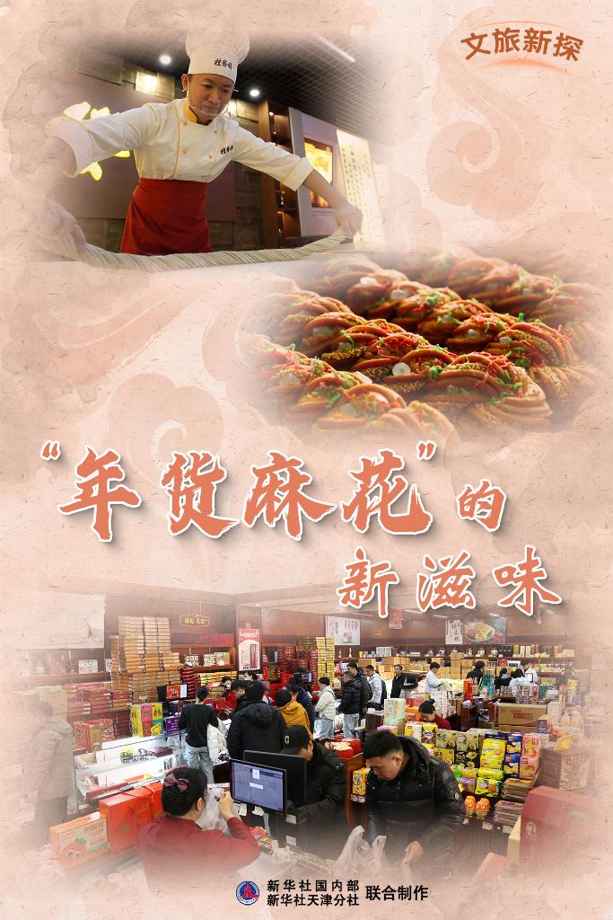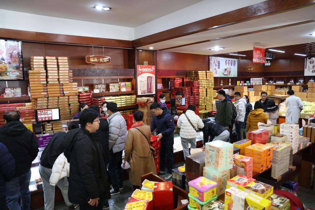 临近除夕,天津桂发祥十八街麻花旗舰店内人头攒动,以麻花为主的年货商品包装精美、琳琅满目,多个收银台前叫单不断、排起长队。