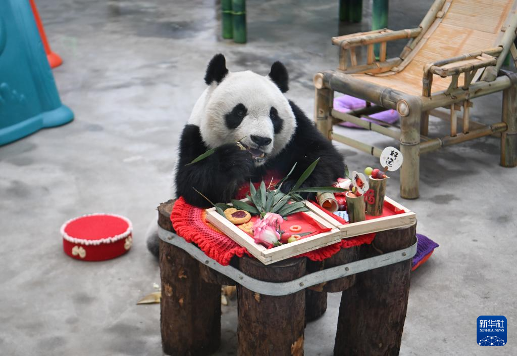 当日,天津动物园的保育员和营养师团队为园区内的大熊猫“喜乐”“格格”精心准备了丰盛的节日大餐,让“国宝”们尽享浓郁年味儿。