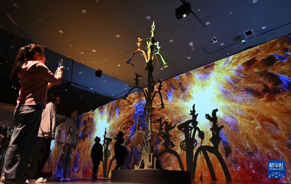 近日,“一醒惊天下·三星堆沉浸式光影艺术展”在位于天津的国家海洋博物馆开展。展览借助科技互动与文物展示,通过美术、音乐、灯光等数字化多媒体手段,打造沉浸式历史空间,展现三星堆遗址的艺术美学、青铜器文化、祭祀文化、精神传承等多方面内容,带领观众感受青铜与光影的碰撞。