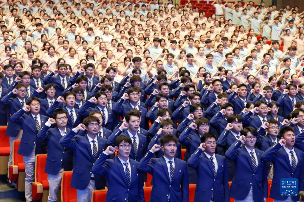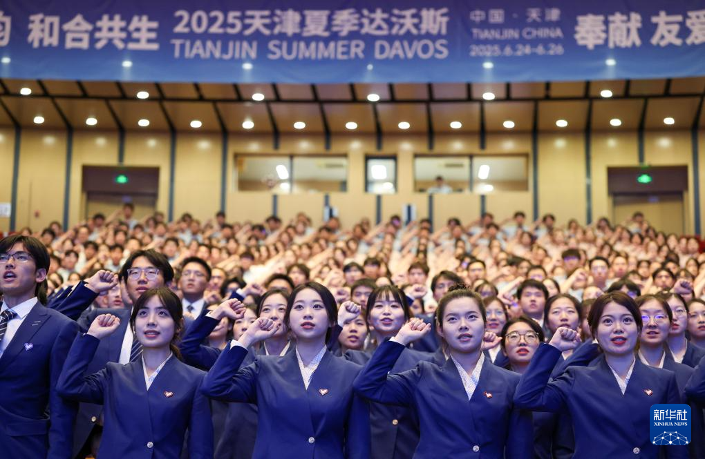6月21日,在天津大学北洋园校区,志愿者在2025天津夏季达沃斯论坛志愿者上岗仪式上宣誓。新华社记者 孙凡越 摄
