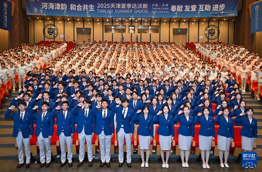 当日,世界经济论坛第十六届新领军者年会(2025夏季达沃斯论坛)青年志愿者上岗仪式在天津大学北洋园校区举行。