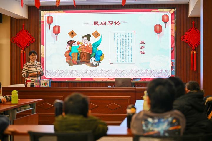 在天津市河东区大王庄街道麟祥里社区活动室,社区志愿者带领小朋友了解春节民俗。新华社记者 孙凡越 摄