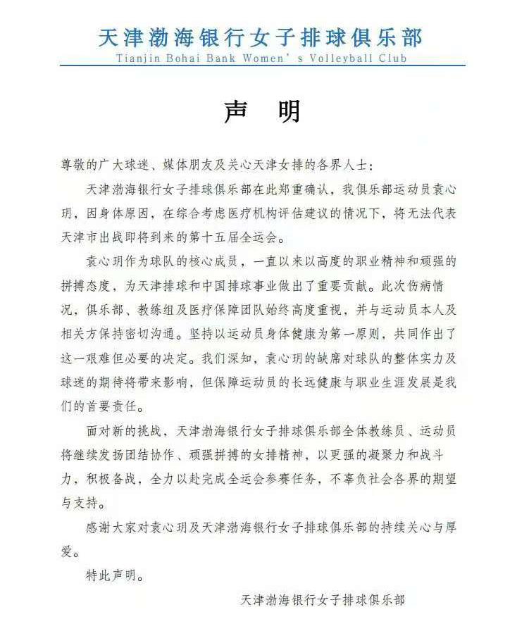 新华社天津10月18日电(记者张泽伟)天津渤海银行女排俱乐部17日深夜发布声明称,袁心玥因伤病原因将缺席第十五届全运会。