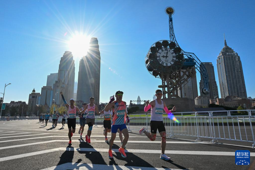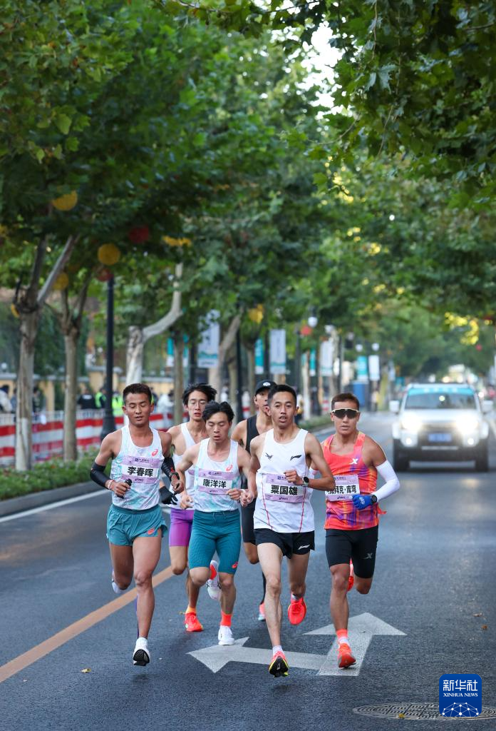 10月26日,参赛选手康洋洋(左三)在比赛中。最终,他以2小时17分06秒的成绩获得男子组冠军。新华社记者 孙凡越 摄