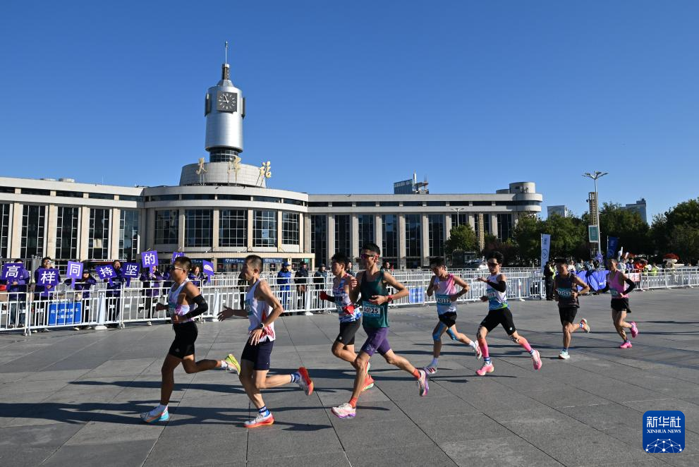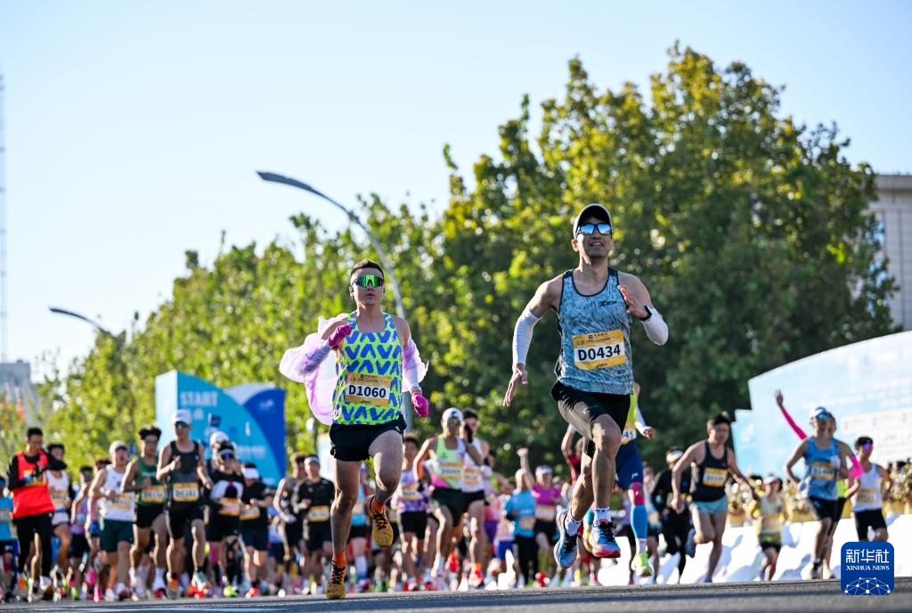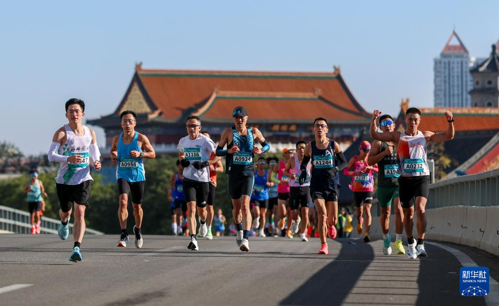 10月26日,参赛选手康洋洋在比赛中冲刺。最终,他以2小时17分06秒的成绩获得男子组冠军。新华社记者 赵子硕 摄pagebreak
