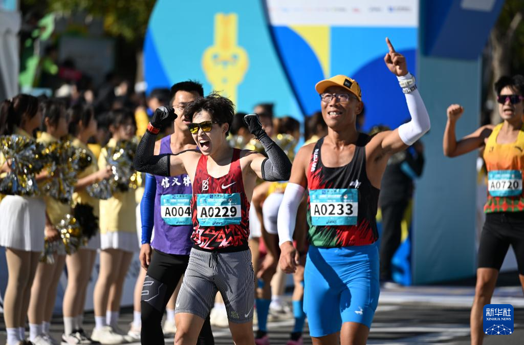 10月26日,参赛选手在冲过终点后庆祝。新华社记者 赵子硕 摄pagebreak
