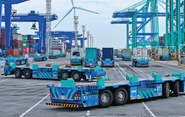 智能水平运输机器人行驶在天津港第二集装箱码头(2025年6月19日摄)。赵子硕摄/本刊