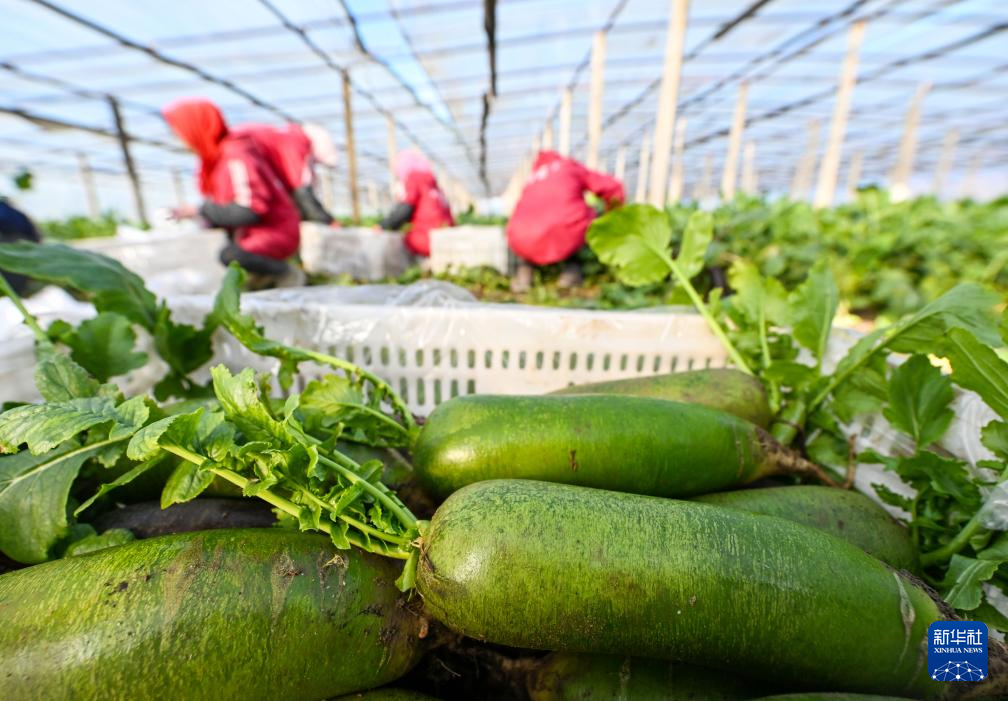 11月20日,在天津市西青区辛口镇种植沙窝萝卜的大棚内,农民在采摘萝卜。新华社记者 赵子硕 摄