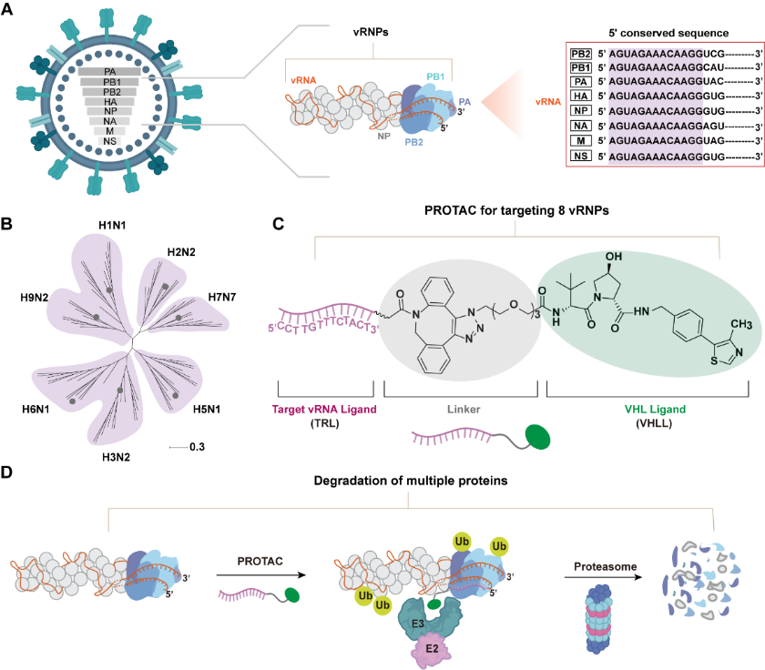 刘书琳介绍,该团队开发了一种名为“多路复用PROTAC”的抗病毒策略。其核心机制在于巧妙地利用了靶向病毒RNA中一段高度保守、被视为“通用密码”的5’非翻译区。基于此,他们团队的研究人员设计了一种多功能PROTAC分子,该分子一端能精准识别并结合病毒“通用密码”,另一端则负责招募人体细胞内固有的蛋白质降解系统——蛋白酶体。这种设计使得该分子如同一位“特洛伊木马”,进入被感染的细胞后,能同时钩住病毒复制核心——病毒核糖核蛋白复合体和细胞的“粉碎机”,从而为病毒的核心蛋白打上“销毁”标记,进而引导细胞机器将这些病毒复制的关键零件彻底降解,从源头上摧毁病毒的复制能力。