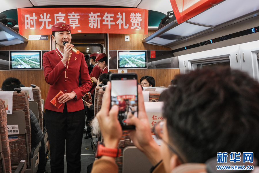 12月30日,2026新年即将到来之际,铁路天津客运段在由天津开往北京南C2026次列车上开展了“时光序章 新年礼赞”跨年辞旧迎新主题活动。为让往返京津两地的旅客在旅途中感受浓厚的新年氛围,乘务人员表演了舞蹈等文艺节目、与旅客互动问答、邀请旅客写下新年心愿,并送上精心准备的新年礼物与节日祝福,陪伴旅客迎接即将到来的2026年。(刘超)pagebreak