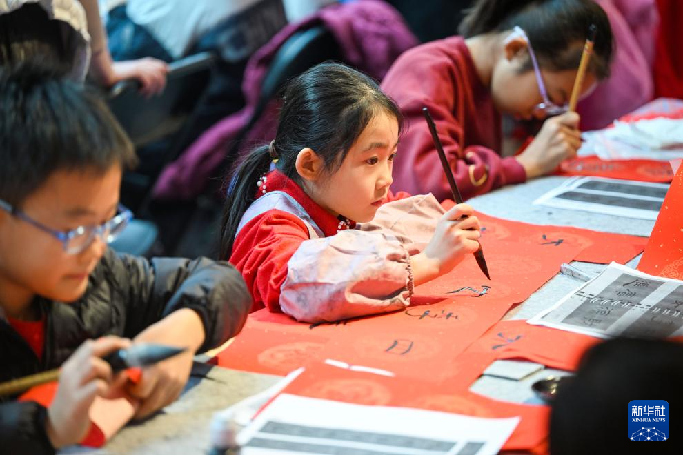 1月24日,在天津市少年儿童活动中心,小朋友在娃娃庙会上写春联。新华社记者 赵子硕 摄pagebreak