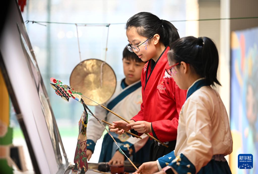 1月24日,在天津市少年儿童活动中心,小朋友在娃娃庙会上表演皮影戏。新华社记者 赵子硕 摄pagebreak