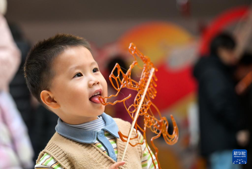 1月24日,在天津市少年儿童活动中心,一名小朋友在娃娃庙会上吃糖画。新华社记者 赵子硕 摄pagebreak
