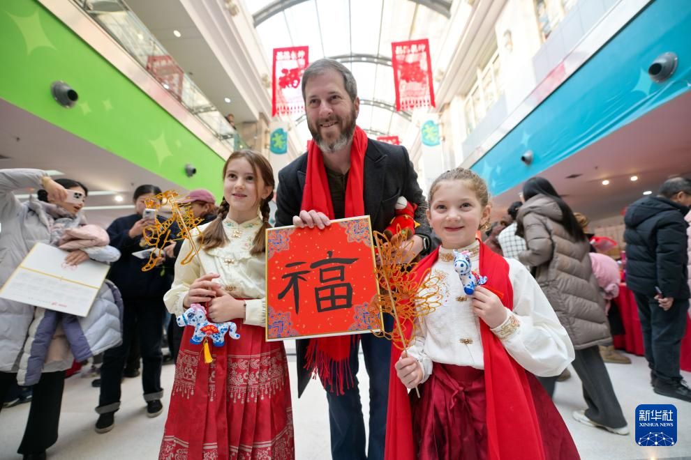 1月24日,在天津市少年儿童活动中心,外国游客在娃娃庙会上合影留念。新华社记者 赵子硕 摄pagebreak