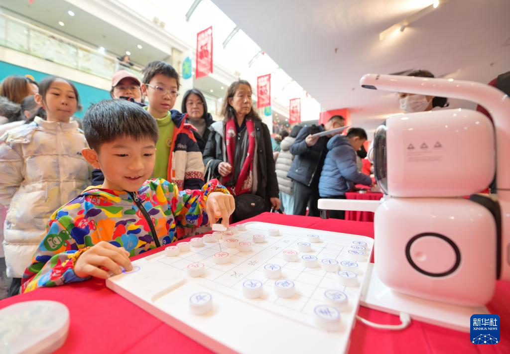 1月24日,在天津市少年儿童活动中心,一名小朋友在娃娃庙会上与机器人下象棋。新华社记者 赵子硕 摄
