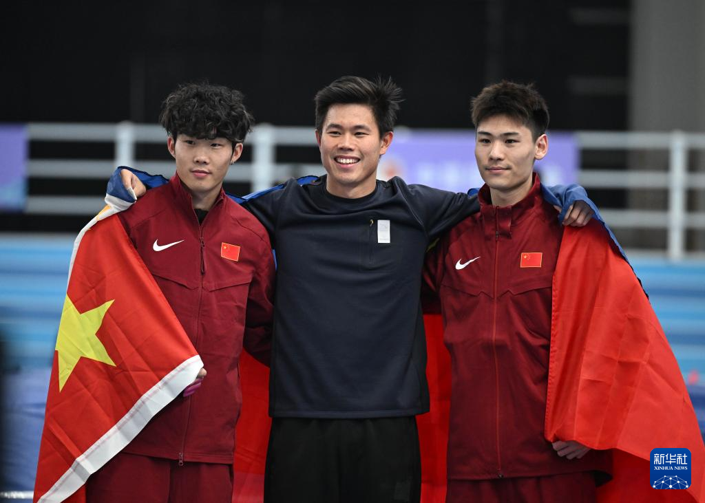 2月7日,亚军中国选手李晨洋(左)、季军中国选手陈阳(右)和冠军菲律宾选手欧内斯特·约翰·奥贝纳在比赛后合影。新华社记者 赵子硕 摄