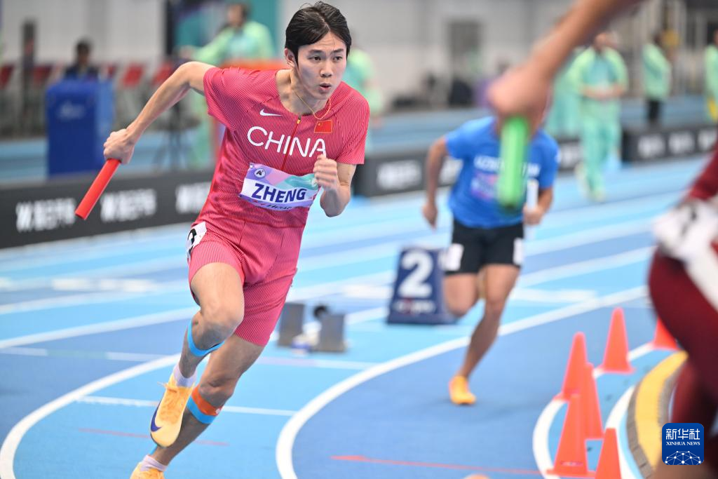 2月8日,中国选手郑驰宇(左一)在男子4x400米接力决赛中,最终中国队获得亚军。新华社记者 李然 摄pagebreak