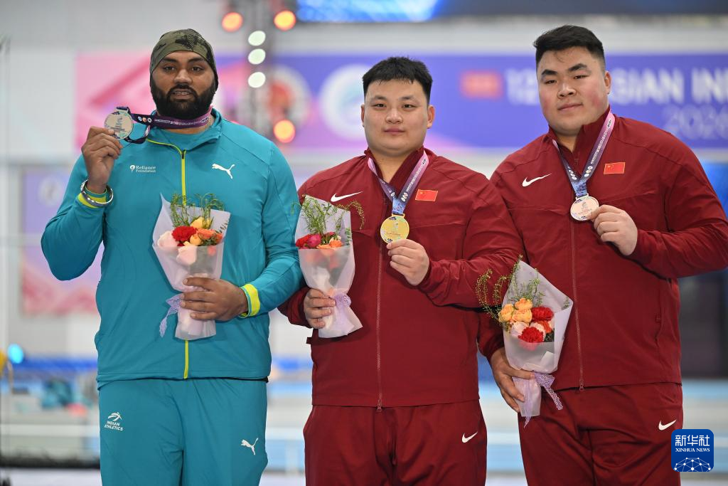 2月8日,男子铅球决赛冠军中国选手陈成雨(中)、亚军印度选手辛格·图尔(左)、季军中国选手邢家梁在颁奖台上。新华社记者 李然 摄pagebreak