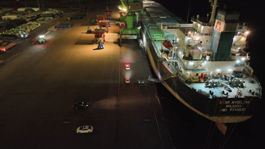 22日晚,装载着1.8万余吨进口钾肥的马绍尔群岛籍“安吉丽娜”轮靠泊天津港汇盛码头。