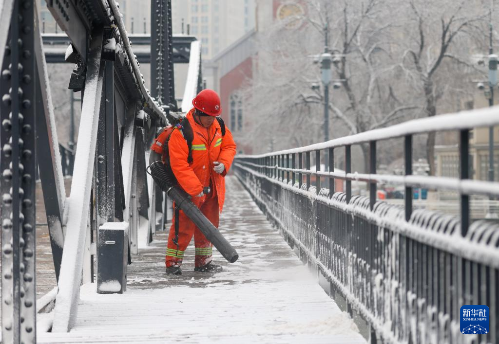 3月2日,环卫工人在天津市金汤桥上吹扫积雪。新华社记者 孙凡越 摄