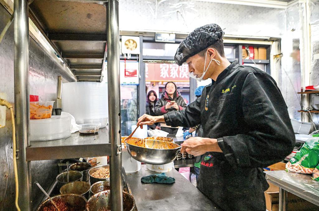 店内热气蒸腾,“90后”老板赵磊站在操作台前,手中的长勺熟练地翻拌着食材。麻酱、辣椒油、秘制料水依次淋下,十几秒的功夫,一碗碗色泽油亮、分量十足的麻辣拌便出了锅。递到顾客手中时,总会收获一句真诚的“谢谢”。