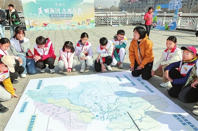 昨日,在古文化街海河亲水平台,老师为小志愿者们讲解海河流域的生态图景。