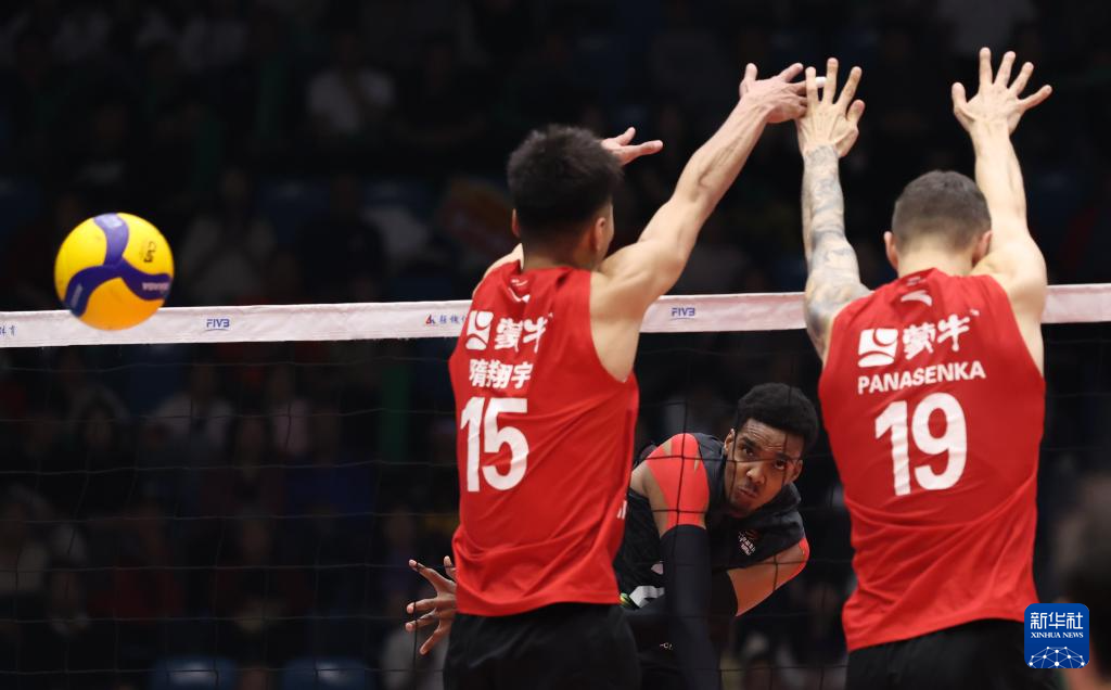 3月29日,天津食品集团队球员菲利克斯(中)在比赛中扣球。新华社记者 孙凡越 摄