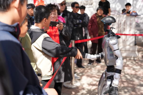 桃园广场上,AI机器人的动感舞蹈与刚劲武术表演引来阵阵喝彩,科技与国风的碰撞让游客耳目一新;机器人人偶与游客亲密互动,成为小朋友们的“团宠”;机器人面具创意手绘活动区同样热闹非凡,孩子们在面具上自由描绘桃花与机甲元素,用色彩勾勒出童趣与创意。