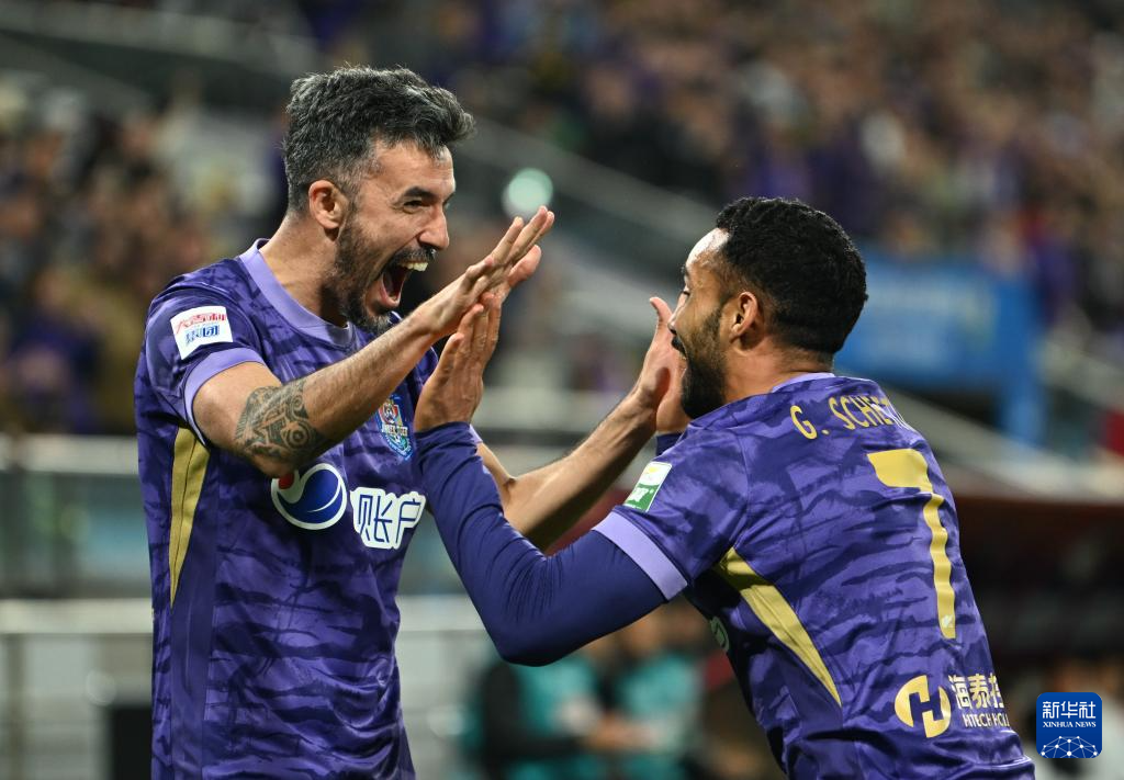 4月21日,天津津门虎队球员谢蒂内(右)与基莱斯在比赛中庆祝进球。新华社记者 孙凡越 摄