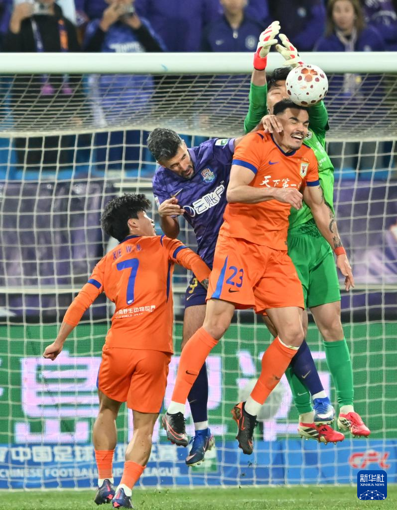 4月21日,山东泰山队球员泽卡(左前)在比赛中头球破门。新华社记者 孙凡越 摄pagebreak