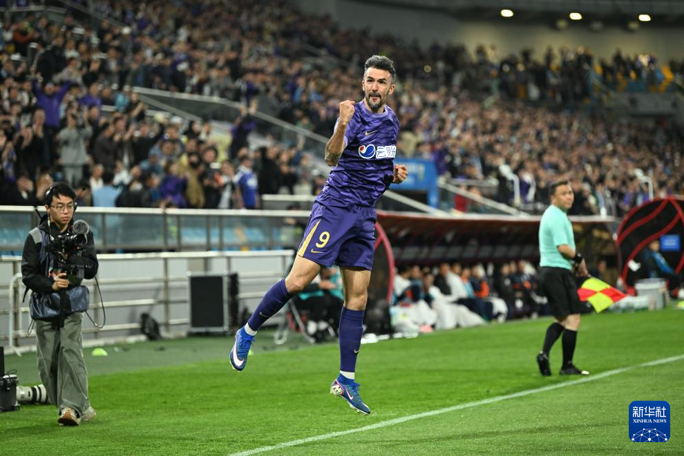4月21日,山东泰山队球员泽卡在进球后庆祝。新华社记者 孙凡越 摄