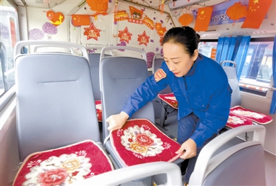 刘靖是公交734路的首班车驾驶员,她提前一个多小时上岗,给停放在场站里的3辆公交车做好防寒措施,在车上的“便民服务箱”里放满自己购买的“暖宝宝”,无偿提供给乘客使用。随后,她又将乘客座位上的棉坐垫逐一铺好、系牢(上图),并在座椅靠背扶手上套上暖心扶手套。“734路属于定点运营班线,服务的都是早出晚归的上班族。这么冷的天,我们必须让乘客在车上足够温暖。”刘靖边忙边说。