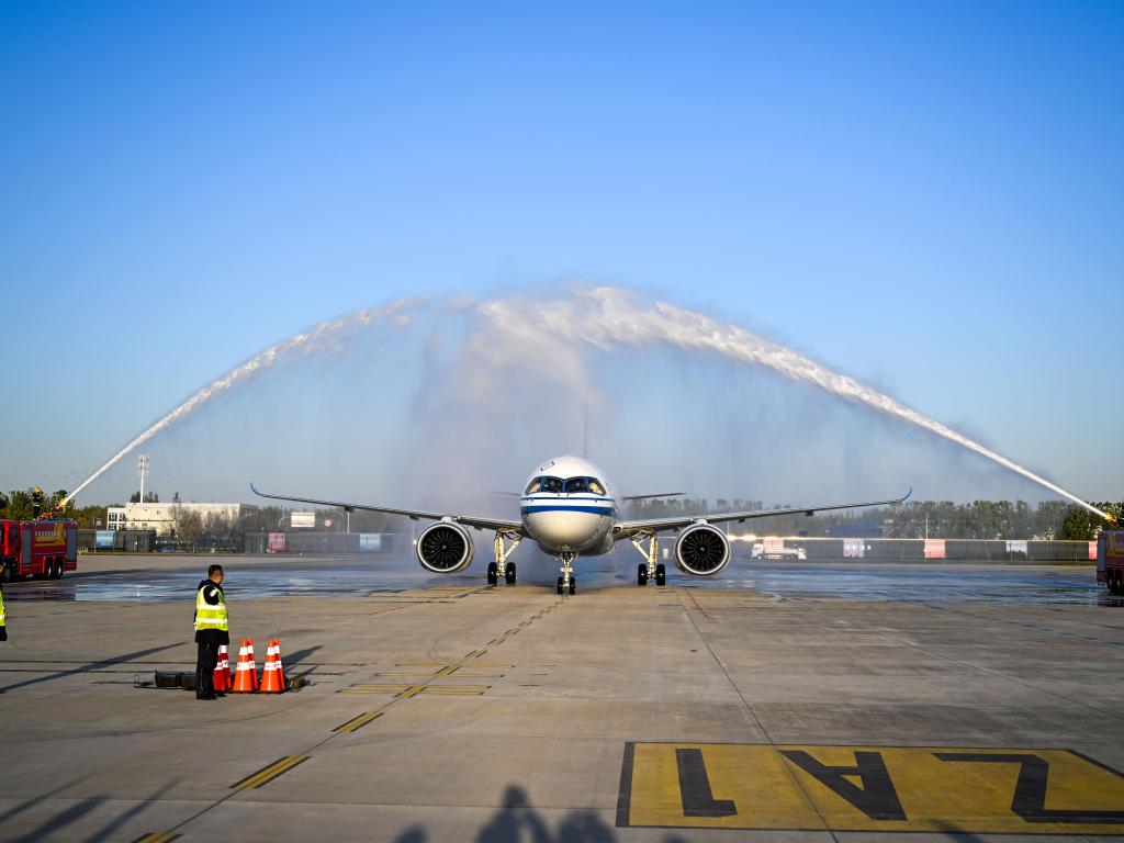 11月9日,国航C919重飞“两航起义”航线主题航班从香港飞抵天津,重温76年前“两航起义”的北飞航程,致敬“两航起义”爱国壮举。