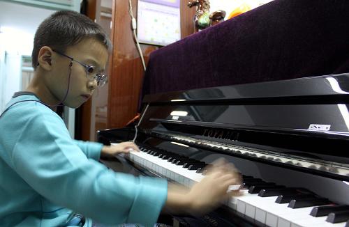 张证恩熟练地在钢琴上弹奏自编的曲子。
