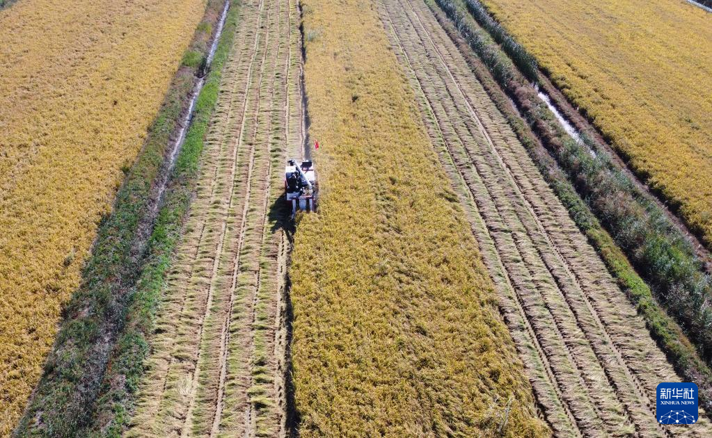 10月14日,收割机在天津市津南区小站镇会馆村小站稻核心种植区作业。新华社记者赵子硕摄pagebreak