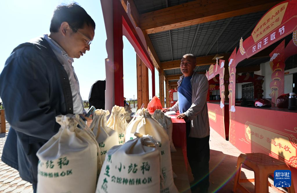 10月14日,游客在天津市津南区小站镇会馆村小站稻核心种植区购买小站稻米。新华社记者赵子硕摄pagebreak
