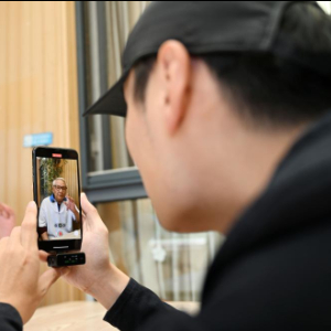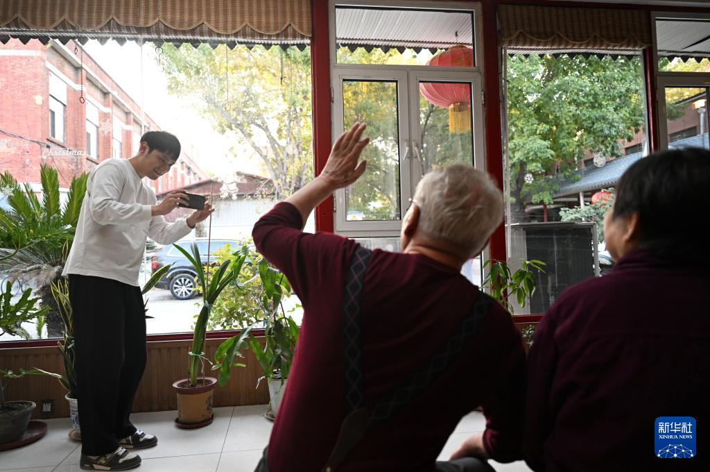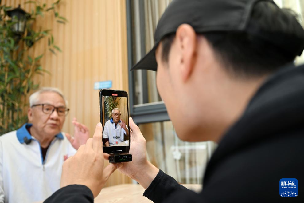 10月20日,陈卓在静雅老人院内为老人们拍摄短视频。新华社记者赵子硕摄pagebreak
