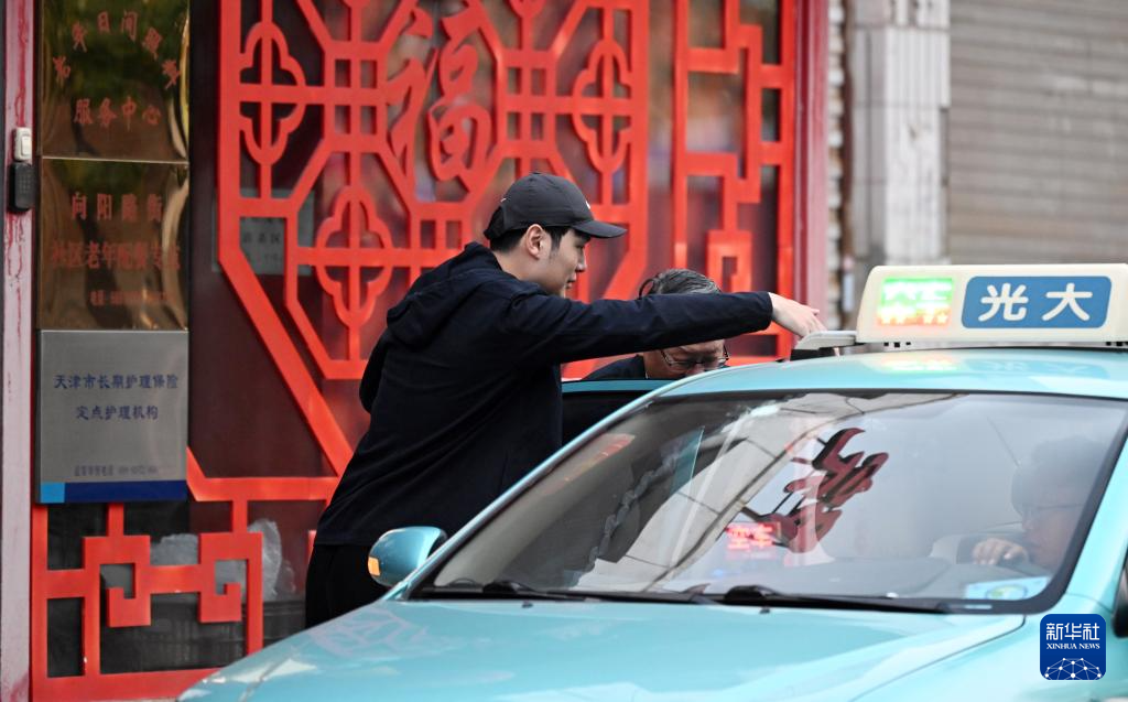 在静雅老人院门口,陈卓照顾老人上车(10月21日摄)。新华社记者李然摄