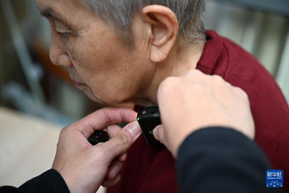 10月20日,在静雅老人院,陈卓为一位老人别上麦克风准备拍摄短视频。新华社记者赵子硕摄pagebreak