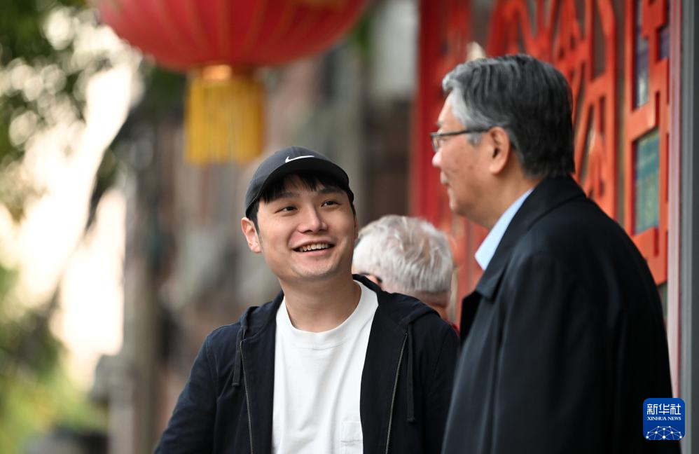 在静雅老人院门口,陈卓和老人交谈(10月21日摄)。新华社记者李然摄pagebreak
