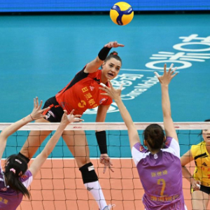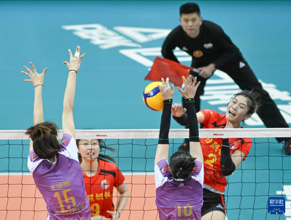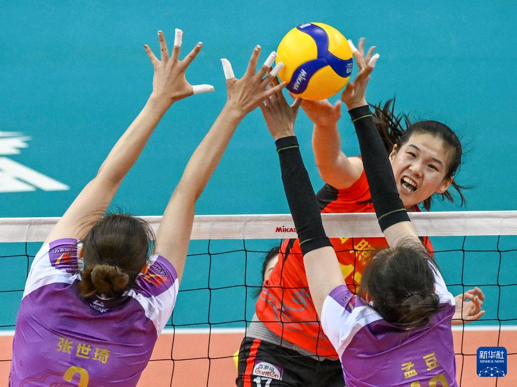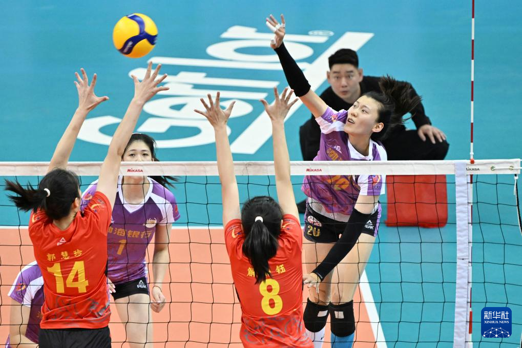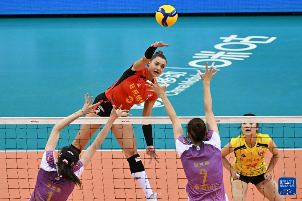 11月4日,天津渤海银行队球员王艺竹(右一)在比赛中扣球。新华社记者 李然 摄