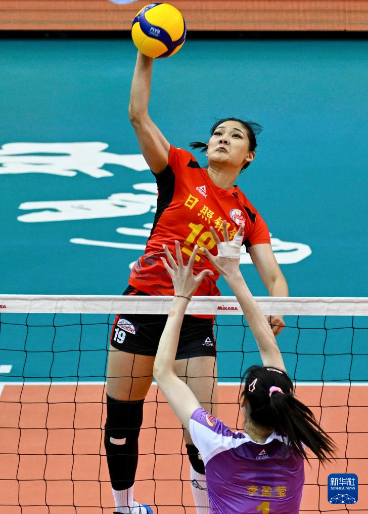 11月4日,山东日照钢铁队球员妮科莱塔(上)在比赛中扣球。新华社记者 李然 摄pagebreak