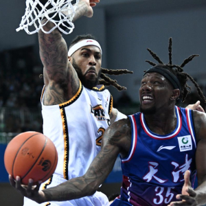 11月6日,天津先行者队球员马克(右)在辽宁本钢队球员莫兰德的防守下上篮。新华社记者 孙凡越 摄pagebreak