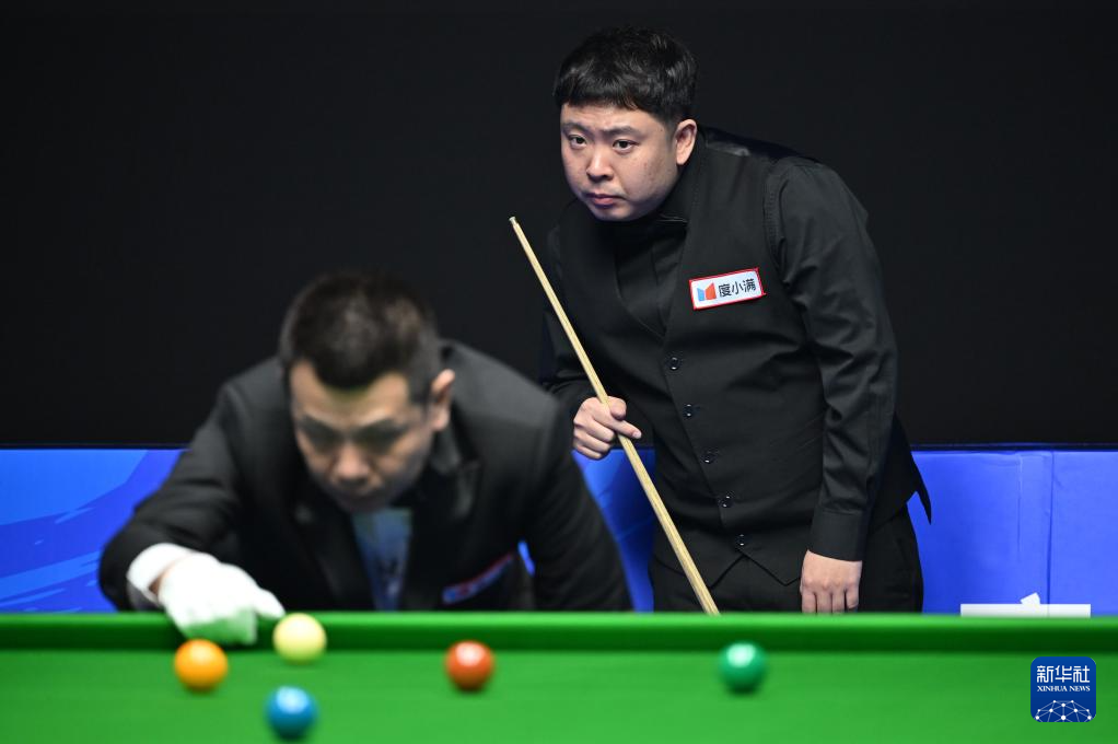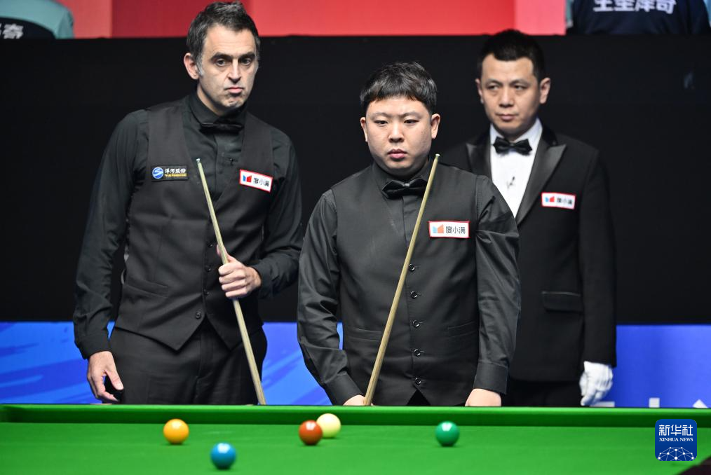 11月11日,罗尼·奥沙利文(左)和张安达(中)在比赛中。新华社记者 李然 摄pagebreak