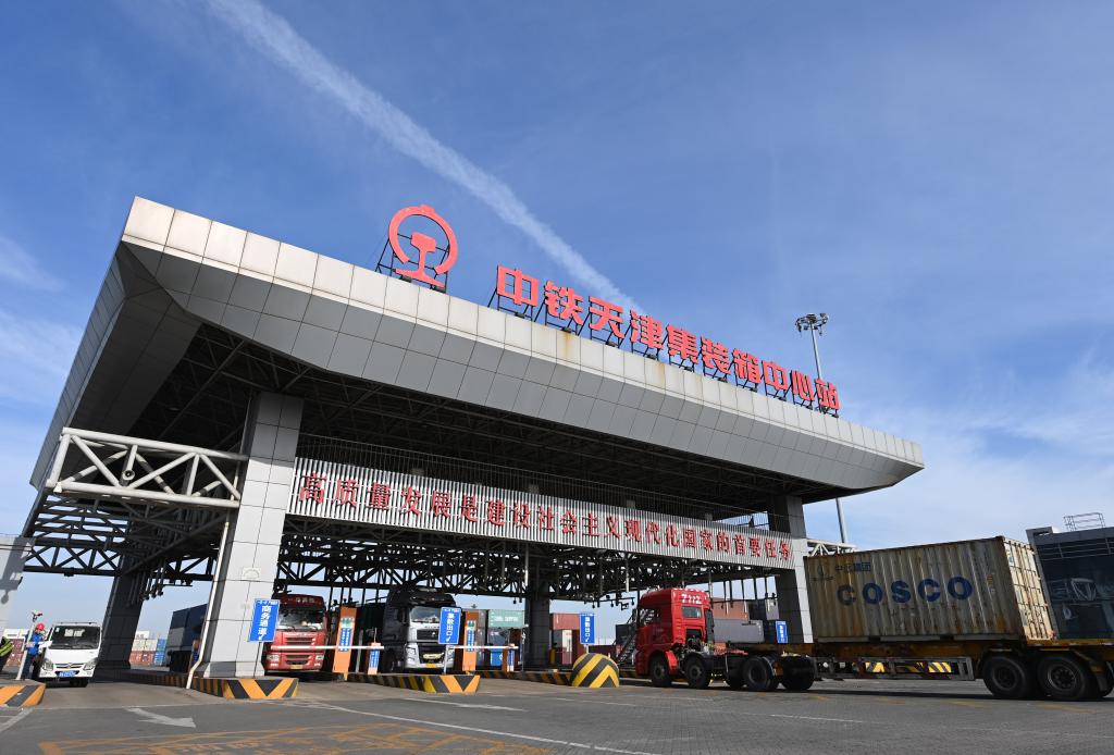 11月13日,装载集装箱的卡车驶入中铁天津集装箱中心站。新华社记者 赵子硕 摄