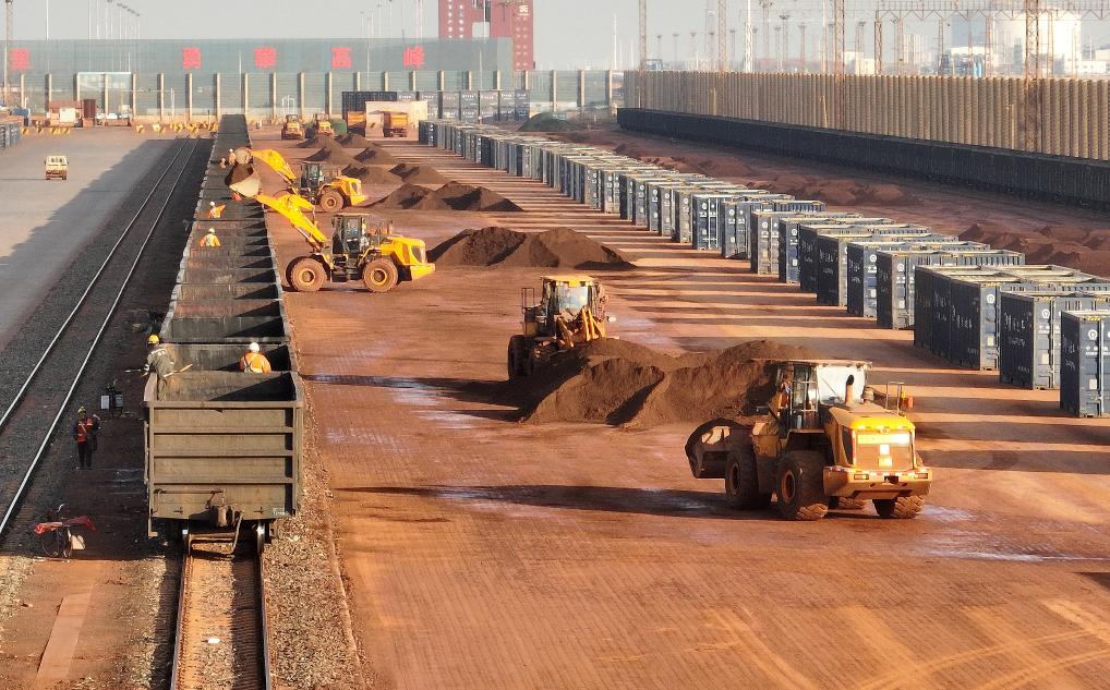 11月13日,在天津港“公转铁”“散改集”双示范基地内,铲运机将铁矿石装入集装箱内(无人机照片)。新华社记者 赵子硕 摄pagebreak